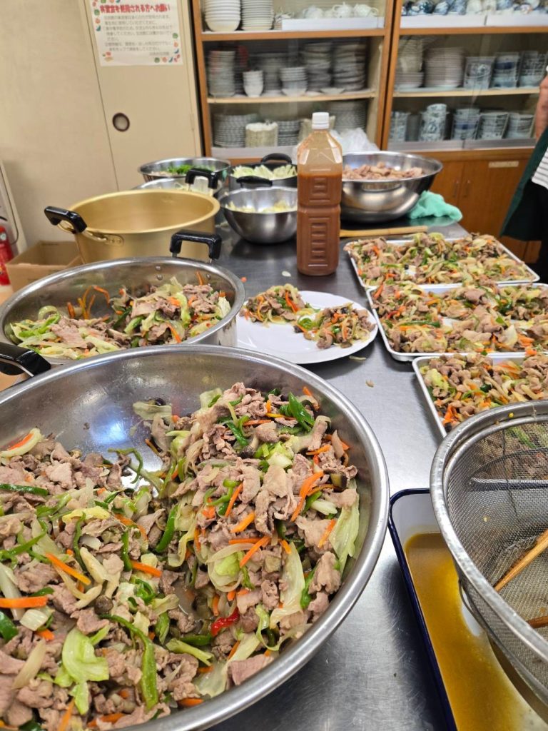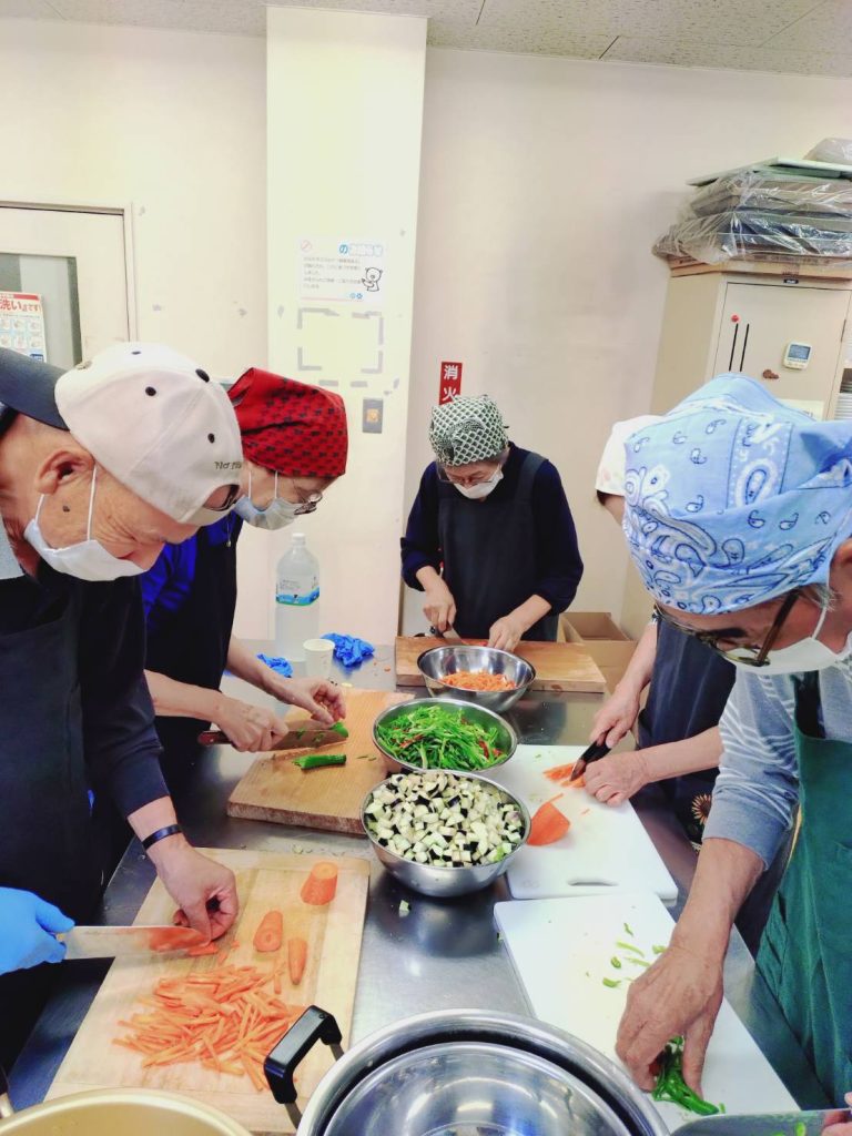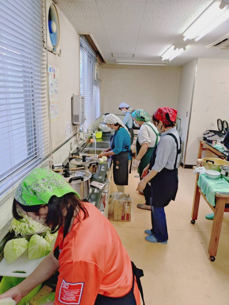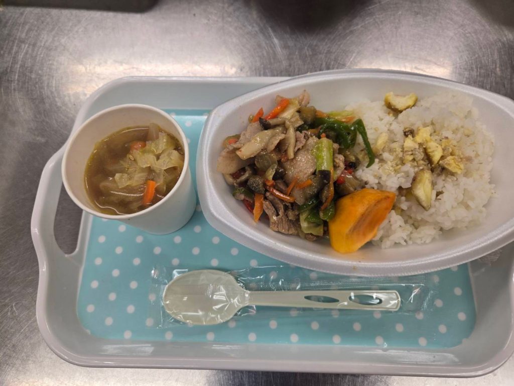 第4回目となるこの日の献立は、栗と野菜等のご寄付もあり、秋の季節感あふれる栗ご飯と、宮崎ポークの野菜炒め、野菜たっぷりのスープが、ボランティアさんの美味しく料理したい意気込みで用意されました。