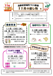 過ごしやすい季節となりました。11月の健康教室は、体操と食の教室があります。 奮ってご参加ください。グラウンドゴルフやパッチワーク教室も参加者を募集しています。 健康づくりのために、興味のある方はお立ち寄りください。