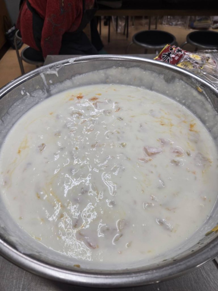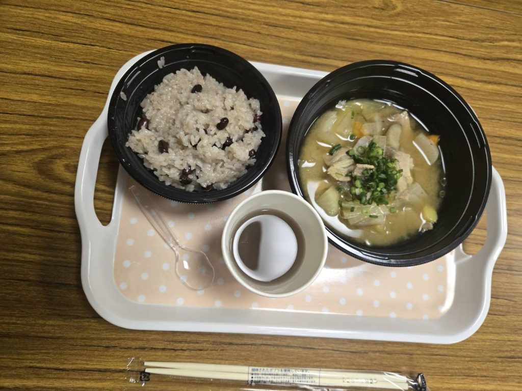 メニューは、JA福山市春日支店よりご寄付のもち米で「赤飯」社会福祉協議会から提供された豚肉や地域の方から野菜も届けられ「具だくさんの豚汁」を100食余り用意することができました。