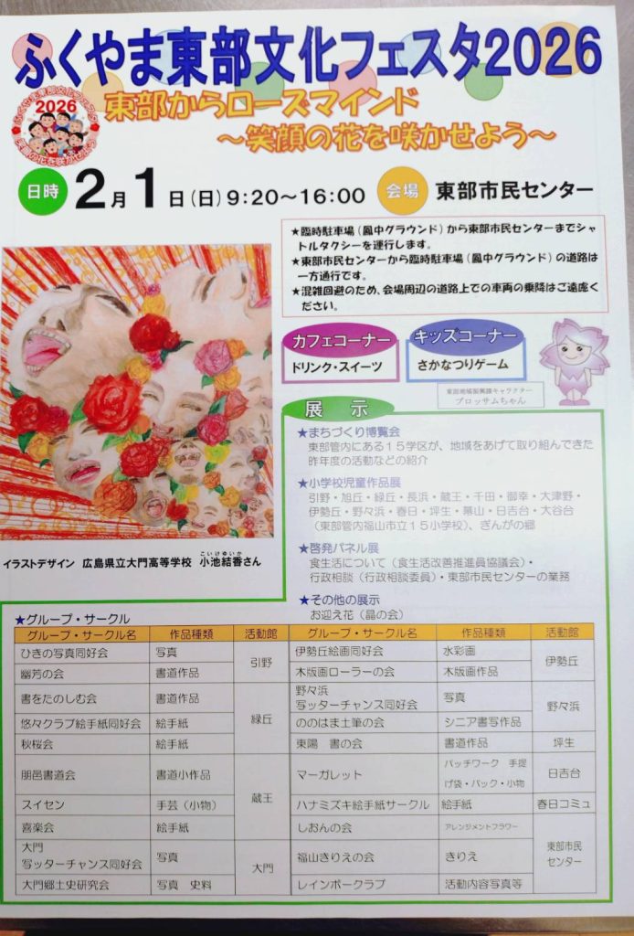 ふくやま東部文化フェスタ2026 2026年1月27日 最終更新日時 : 2026年1月27日 user004日時:2月1日(日)9:20~16:00 会場:東部市民センター日吉台学区からも交流館サークル『れんげ』、高齢者支援事業より『珈琲サロン憩い』『パッチワーク教室マーガレット』が参加します。