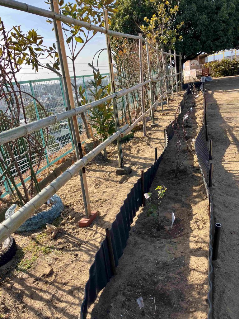 その作業も一段落し、新たに花壇整備を始めました。園庭東にシートで囲い、土入れをして既存の花壇では狭くなったばらにゆとりを持たせるために15本ほど移植、そして大きくなったつるばらも竹の支柱を設け広々と誘引して花を咲かせる予定です。